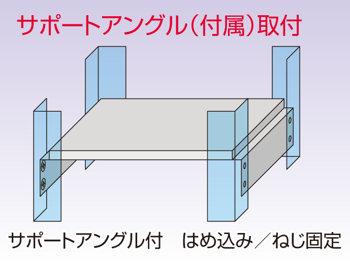 ●サポートアングル(L型レール)をラックのマウントフレームに引っ掛けた後、棚を載せ、パネルラッチまたはねじにて棚を固定するだけでラックに取り付けできます。