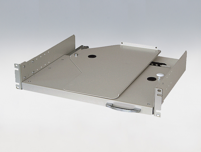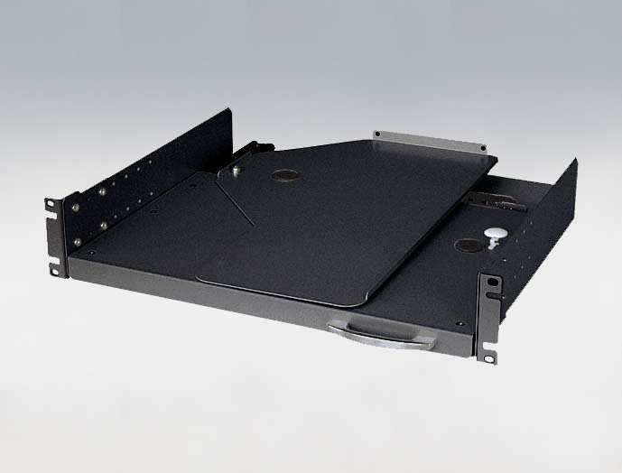 回転して引き出せる、19インチラックマウント仕様のキーボード・マウス用テーブル