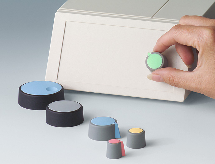 ●コムノブ OKSシリーズは、ノブ(ツマミ)に別売のキャップ・ピークを組み合わせ、美しいデザインとモダンな色づかいで機器に洗練された外観をもたらせます。