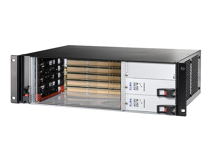 ●EMCシールド仕様19インチシャーシ、ブラック粉体塗装(RAL9005)。