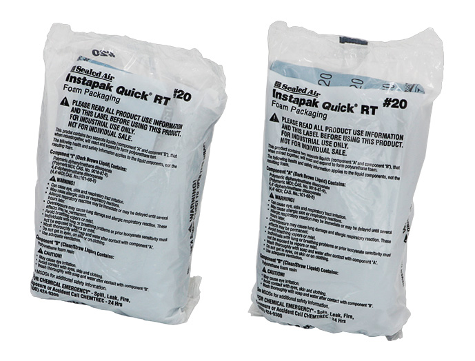 ●袋の中に入っている2種類の液体を混合させることで瞬時に膨らみ、ポリウレタン発泡緩衝材を形成します。