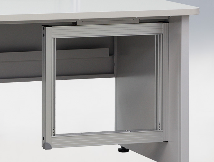 ●7U以上の機種には後面側にもパネルマウントフレームを標準装備しており、この仕様を最大限に活用できる、重量物を支えるサポートアングル(L型レール)や電源供給、ケーブル処理を容易にできる19インチラックアクセサリー等を多数ご用意しております。