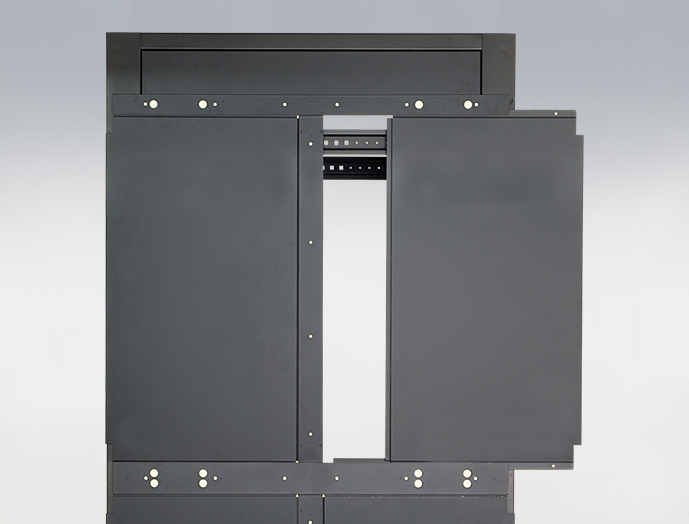 ●19インチマウント部に実装する取付パネルは1U以内に収まっており、取付フレームを開放することで、取付パネルの上下への19インチ機器の実装及びメンテナンスが可能です。