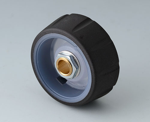 ●堅牢なポリカーボネ-ト製の本体と、機能的な溝を設け、滑り止め効果と心地よい手触りのTPE製グリップを一体成形させたノブです。