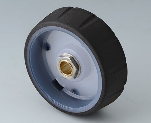 ●堅牢なポリカーボネ-ト製の本体と、機能的な溝を設け、滑り止め効果と心地よい手触りのTPE製グリップを一体成形させたノブです。