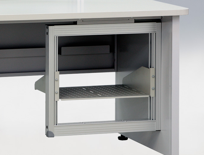 ●デスクの下におさまるコンパクトなサイズは、パソコンやネットワーク用通信機器の収納に適しています。