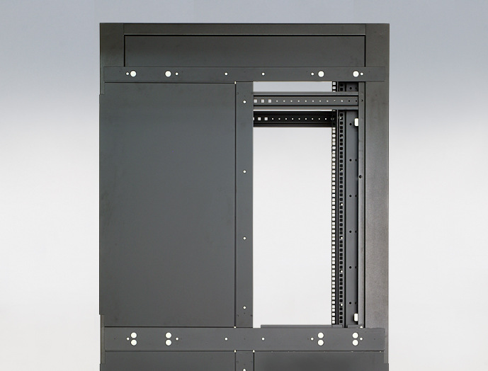 ●19インチマウント部に実装する取付パネルは1U以内に収まっており、取付フレームを開放することで、取付パネルの上下への19インチ機器の実装及びメンテナンスが可能です。