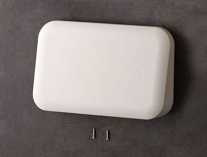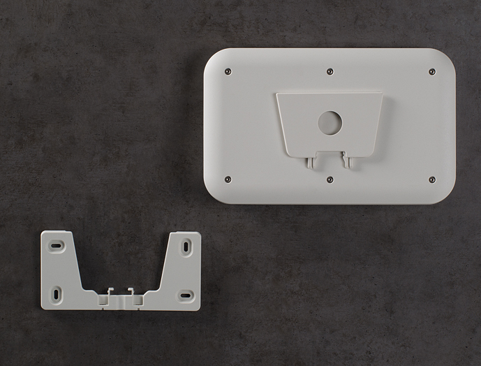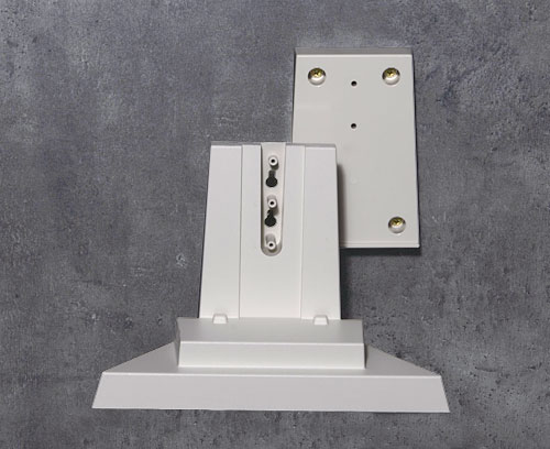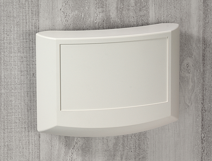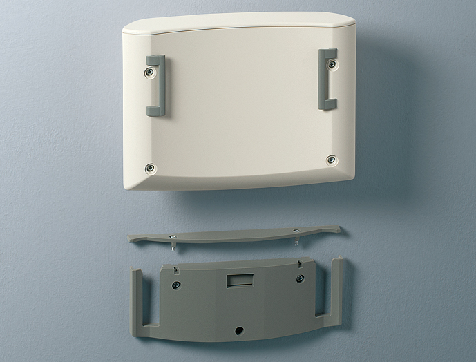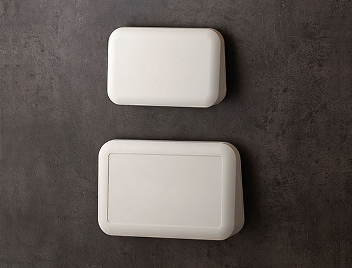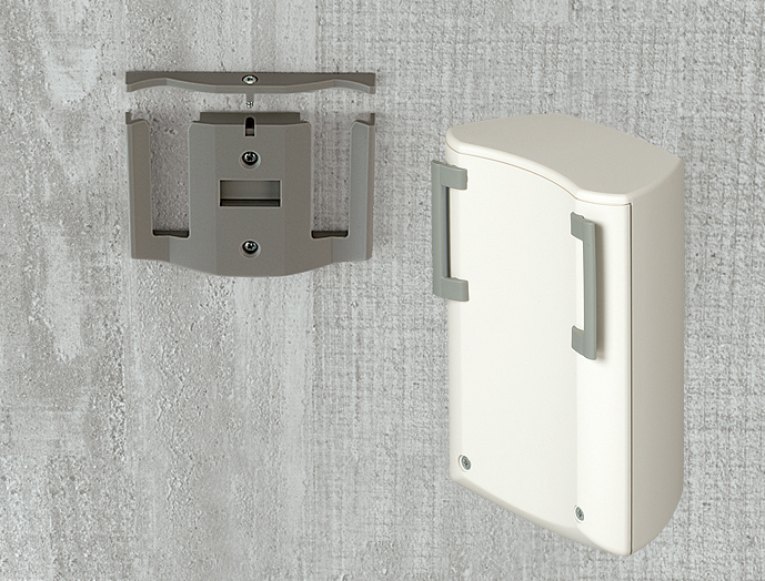 ●操作用のスイッチやLEDが配置し易い平面状の上カバーに、丸パイプ等に添わせる丸いくぼみ状の背面と、壁面ねじ止め取付用フランジの付いた下カバーを組み合わせる構造です。