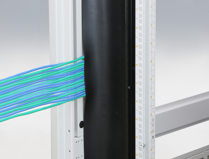 ●パネルマウントフレームとラック内側面の隙間を埋め、収納機器の排出する熱が前面側に回りこむのを遮蔽し、冷却効率を向上します。