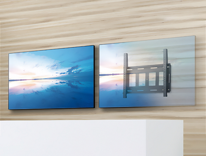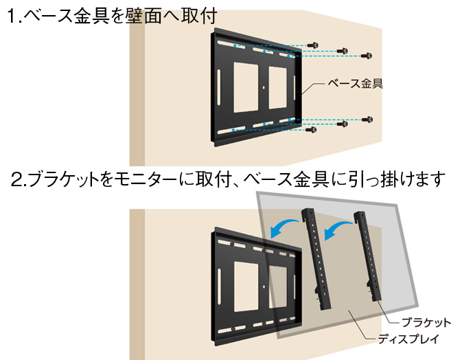 ●ベース金具を壁面へ取り付け、ブラケットをモニターに取り付けてベース金具に引っ掛けるだけのシンプルな設置方法です。