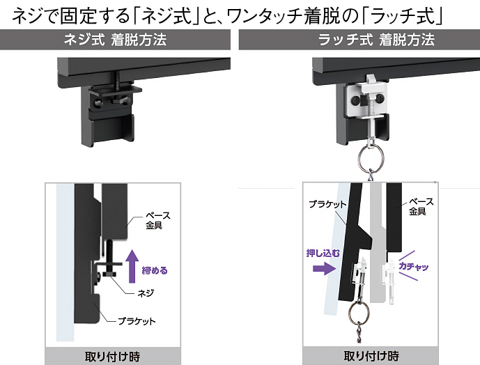 ●ブラケットをネジで固定する「ねじ式」と、ワンタッチ着脱の「ラッチ式」から選択できます。