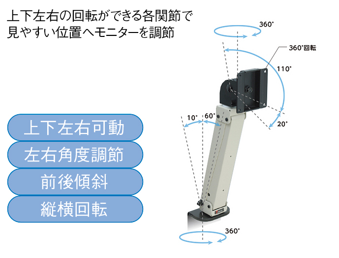 ●上下左右の回転ができる各関節により、見やすい位置や角度にモニターを調節できます。
