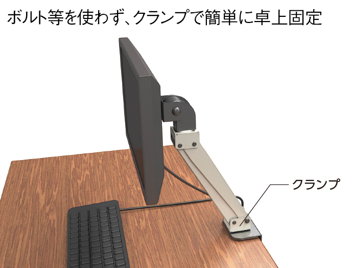 ●卓上取付の場合、テーブル等にボルト等を使わず、クランプで省スペースに手軽に固定可能です。
