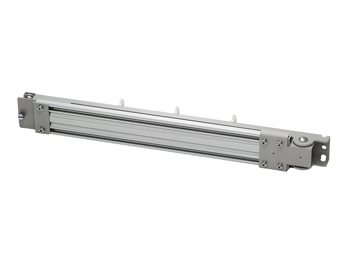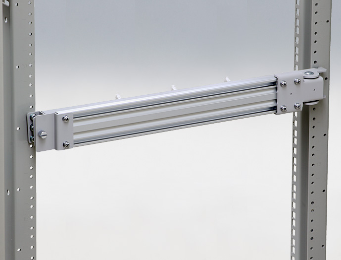 ●19インチマウント部に実装する取付パネルは1U以内に収まっており、取付フレームを開放することで、取付パネルの上下への19インチ機器の実装及びメンテナンスが可能です。