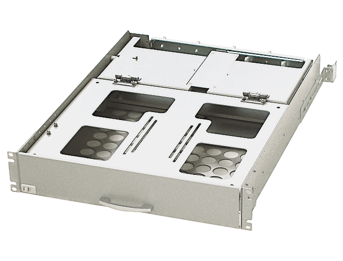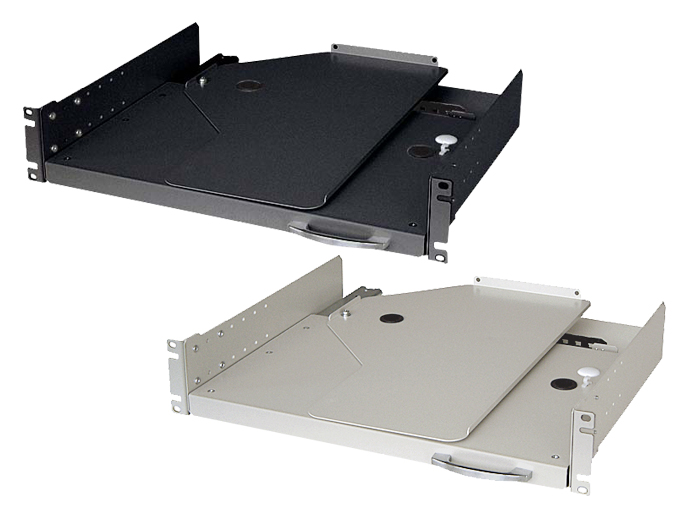 回転して引き出せる、19インチラックマウント仕様のキーボード・マウス用テーブル