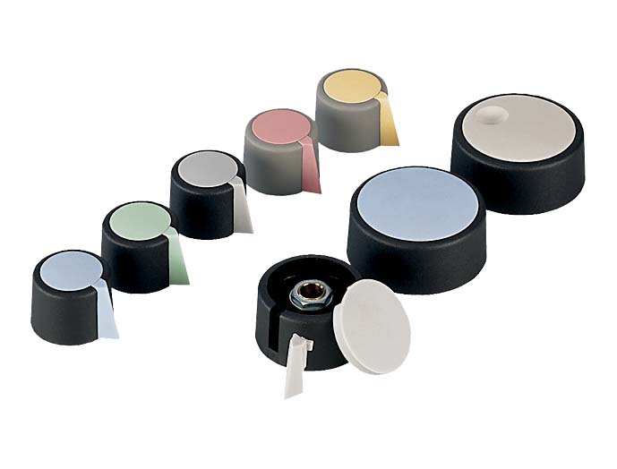 ●コムノブ OKSシリーズは、ノブ(ツマミ)に別売のキャップ・ピークを組み合わせ、美しいデザインとモダンな色づかいで機器に洗練された外観をもたらせます。
