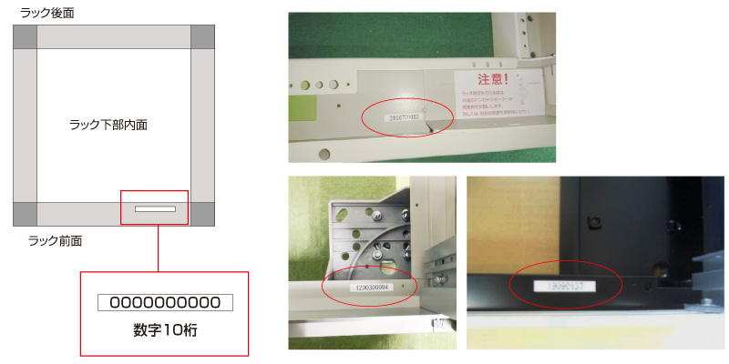 ※2009年9月以前のラックは、貼り付け位置などが異なる可能性があります。また、1990年代以前の古いラックの場合には、シリアルNO.がございません。その場合には型番の特定が困難で有る為、製品の外形サイズと写真等をご提供ください。